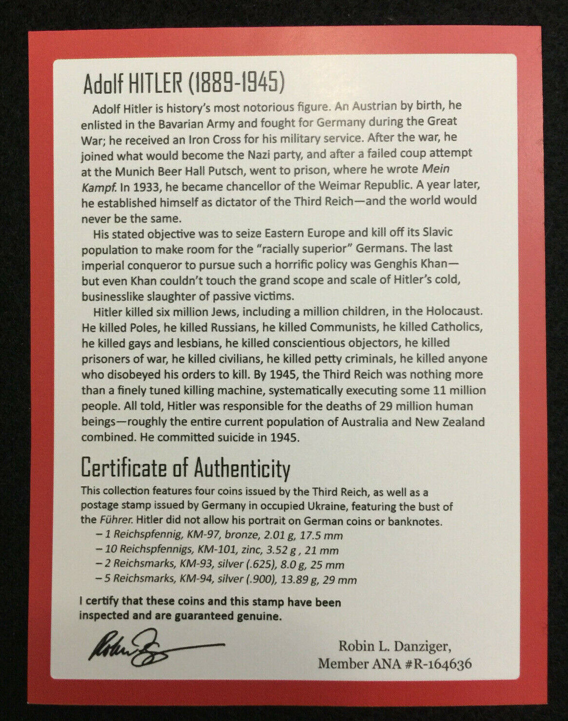 WWII Certified 5 Reichsmarks Silver Coin - Silver(.009),13.89g, 29mm.WWII Certified 2 Reichsmarks Silver Coin - Silver(.625),8.00g, 25mm.WWII Certified 10 Reichspfenning Zinc Coin - 3.2g, 21mm.WWII Certified 2 Reichspfenning Bronze Coin - 2.01g, 17.5mm.WWII Certified Random PF and color Mint Stamp.Certificate Of Authenticity along with history.Secure Capsules.Display Box.